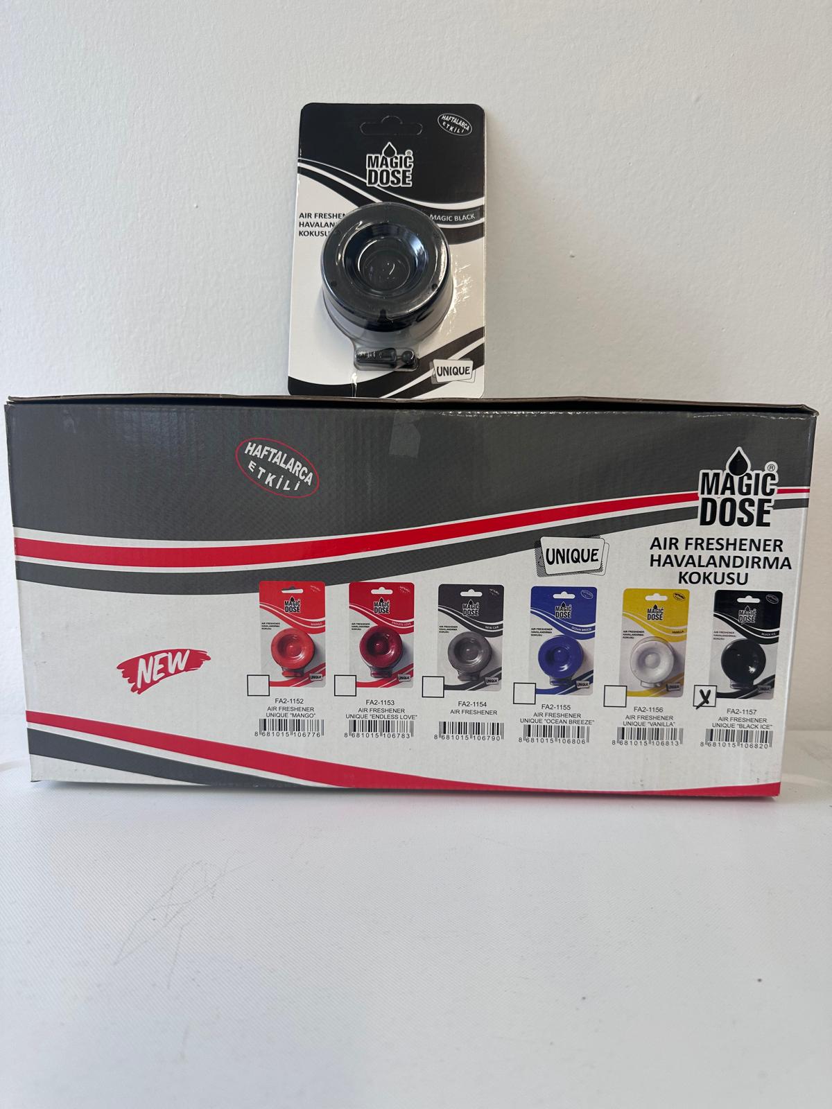 MAGIC DOSE AIR FRESHENER VENTILATION SCENT. Comes in a box of 12 units with various types of scents to choose from, one pictured here is known as Black Magic.